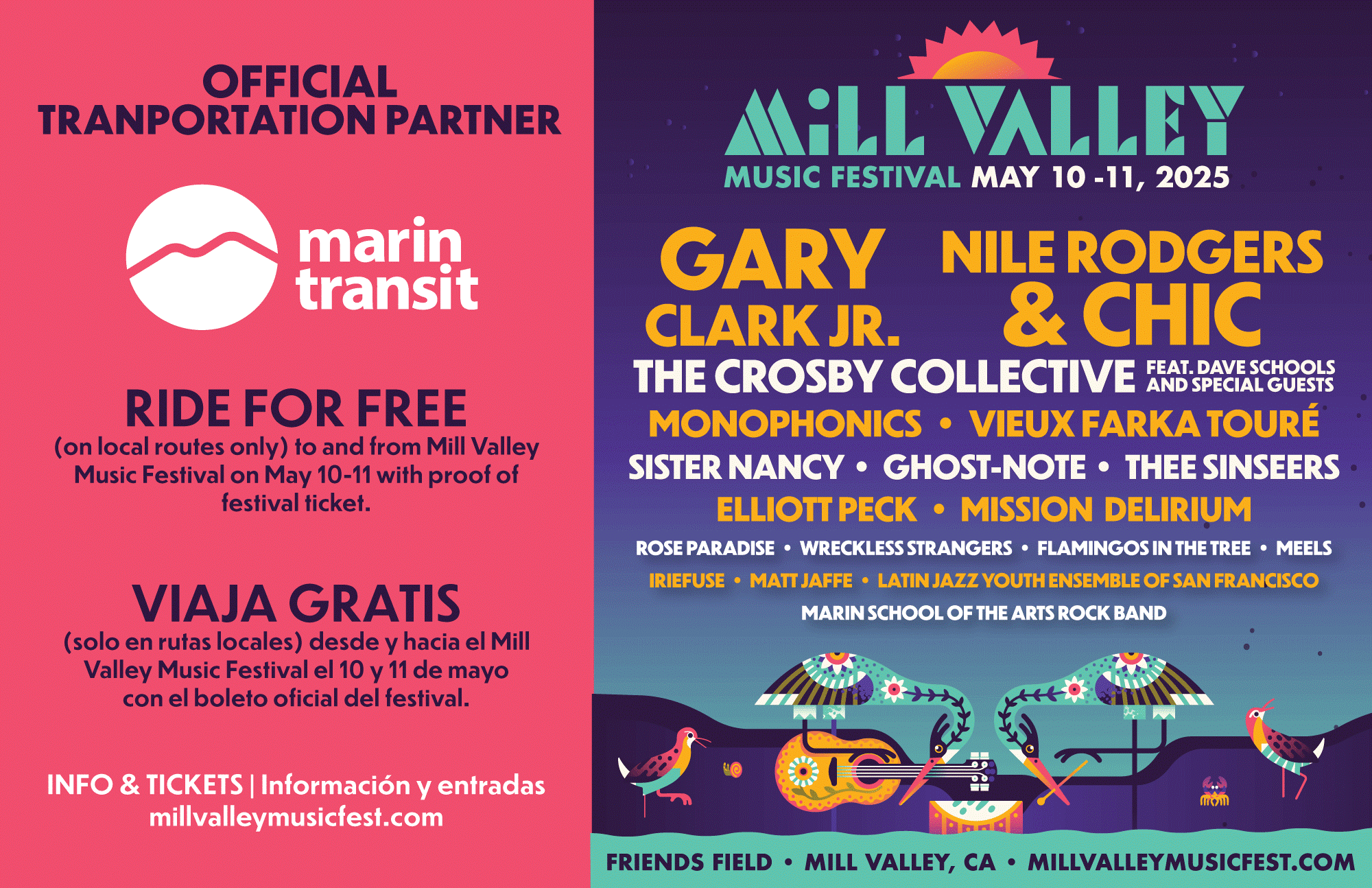 Marin Transit es el patrocinador oficial de transporte del Festival de Música de Mill Valley de este año, que se celebrará los días 10 y 11 de mayo. Todos los abonados al festival podrán viajar gratis de ida y vuelta presentando un comprobante de entrada o una pulsera.
